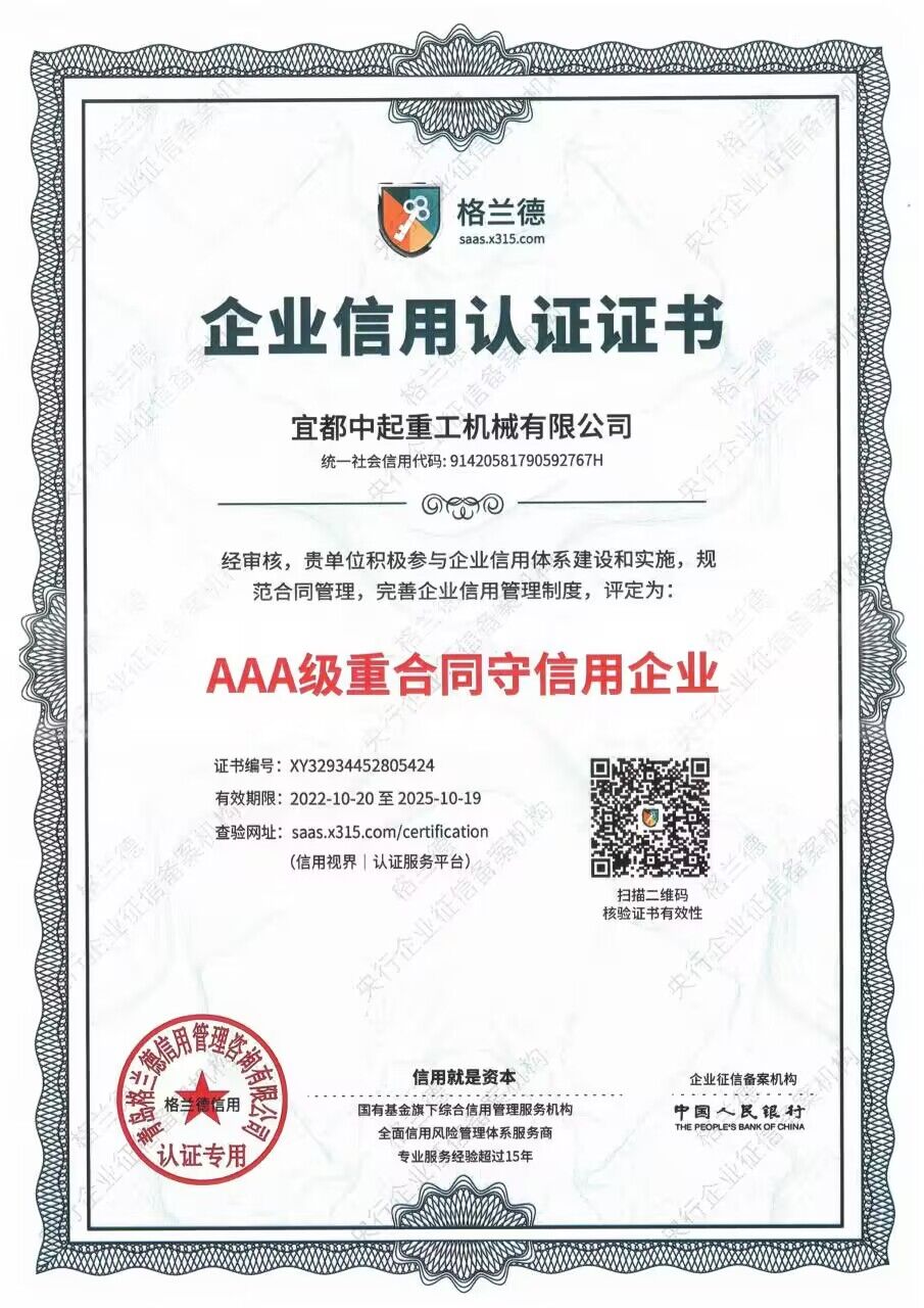 2022年宜都中起重工機(jī)械有限公司被信用視界評為AAA級重合同守信用企業(yè)。