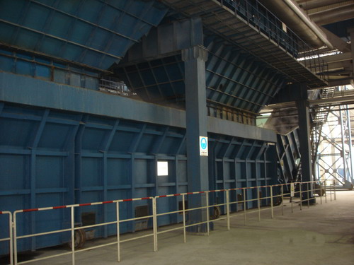 渣井布置在鍋爐下連箱下方,其主要功能是事故性儲渣和吸收鍋爐水冷壁的膨脹量。通常情況下,渣井具有不小于機組在MCR工況下4小時排渣的貯存容積,渣井支承方式通常采用獨立支撐式,當(dāng)采用獨立支撐式時,應(yīng)為下部撈渣機能橫向拉出檢修留有足夠的位置;渣井水封槽能有效地吸收鍋爐水冷壁垂直和水平方向的膨脹量,且水封槽中設(shè)有沖洗排污措施。當(dāng)采用懸吊式安裝時,不設(shè)水封槽,但鍋爐的膨脹量由下部設(shè)備吸收。